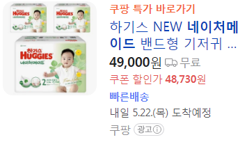 다음날 당장 쓸 기저귀가 없어서 쿠팡에서 급히 주문했습니다. 그 당시 맘큐 50% 할인 쿠폰이 유효기간 종료일이었는데 써보지도 못하고 날려버렸네요.