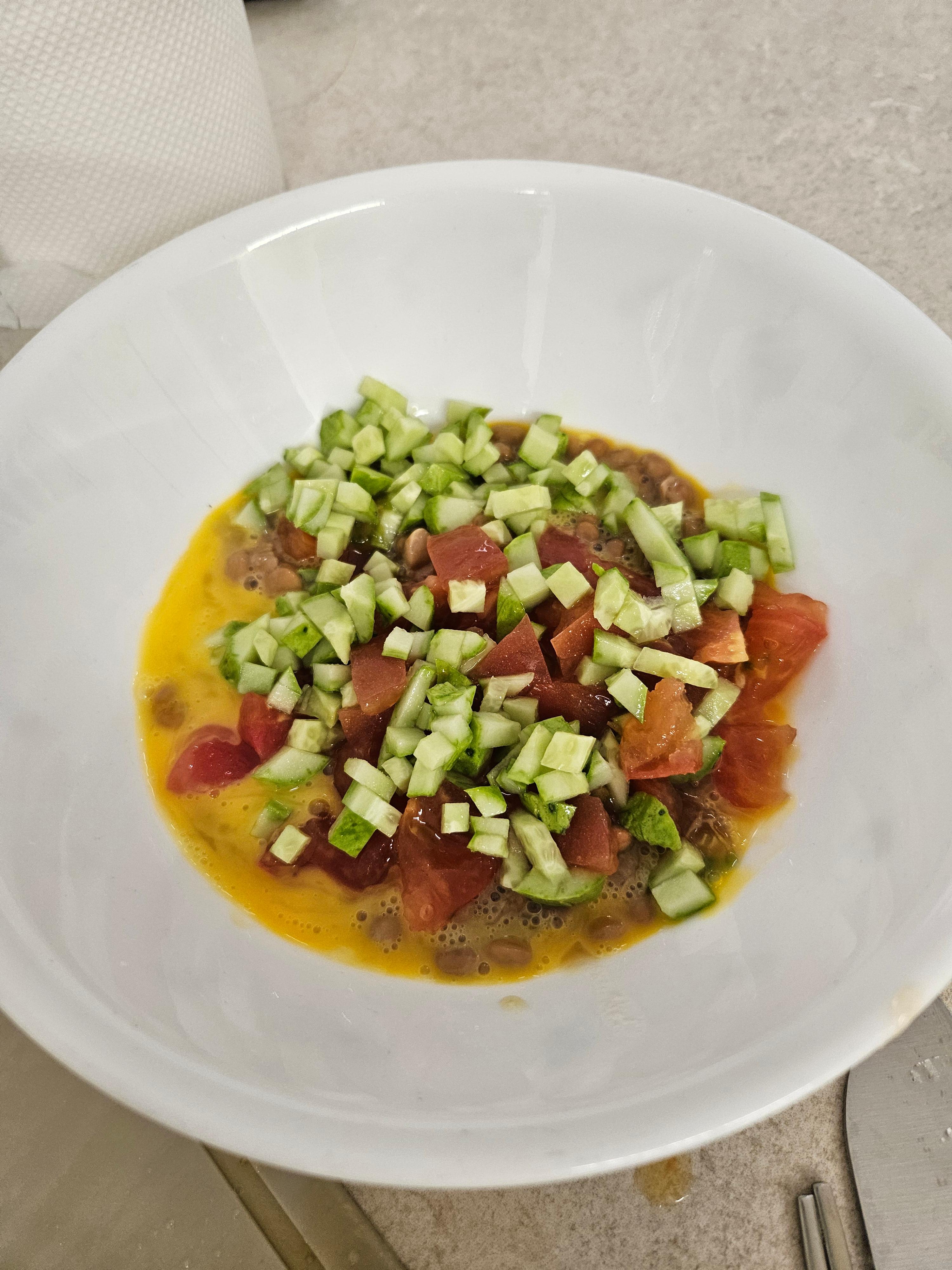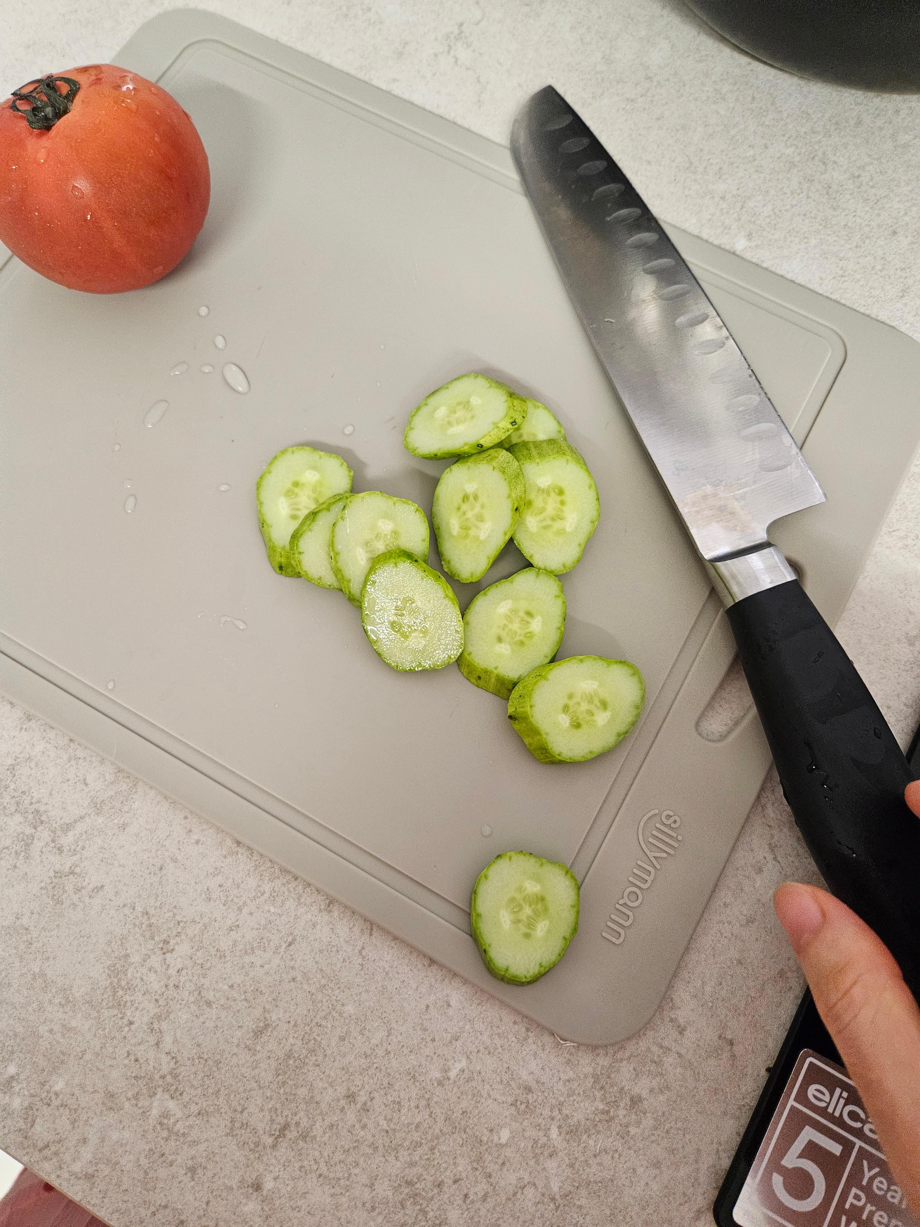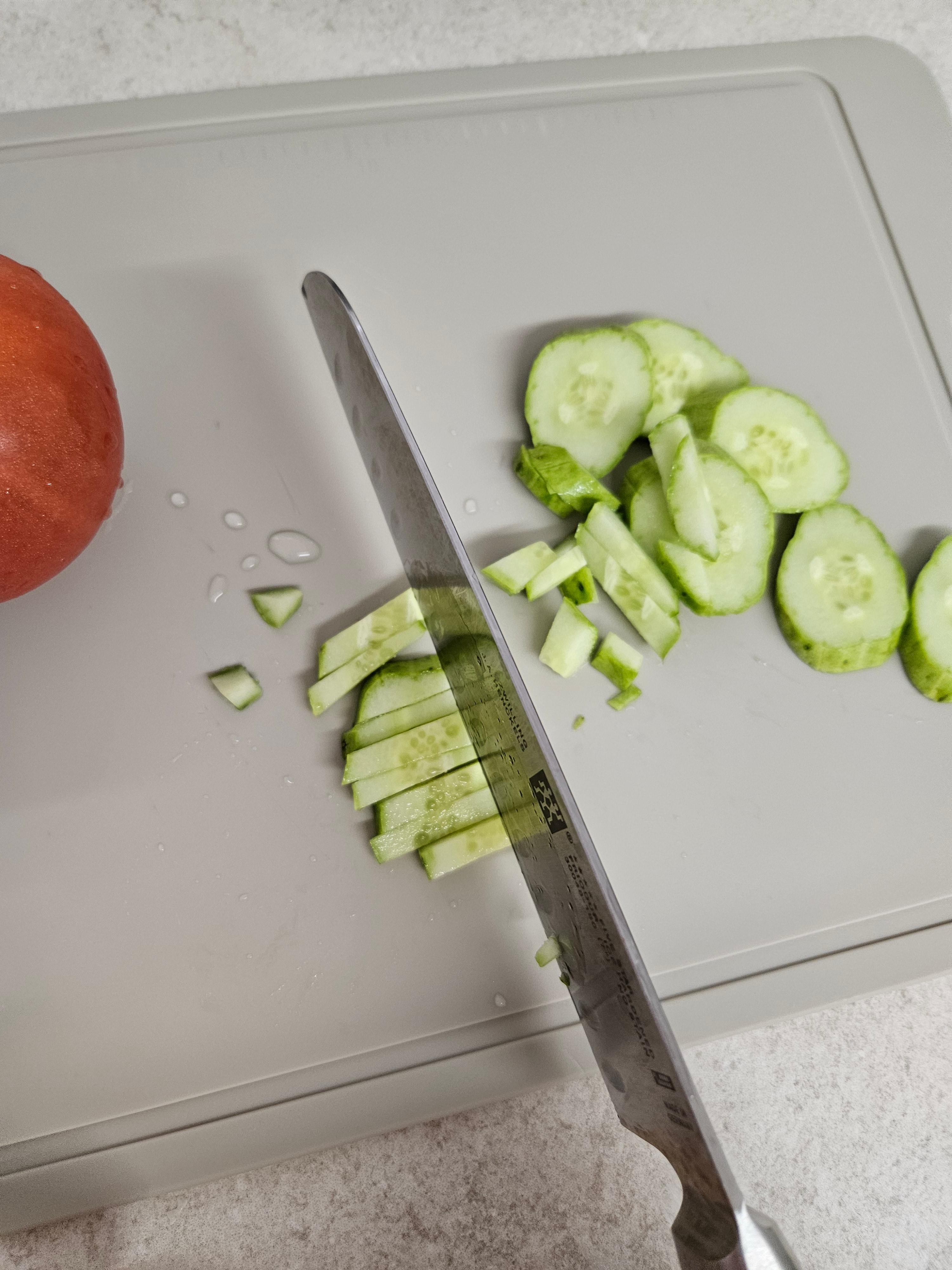 1. 준비해둔 오이와 토마토를 작은 크기로 먹기 좋게 잘라 줍니다