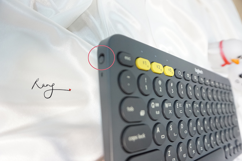 측면에 있는 버튼을 위로 올리면 전원이 켜지고요. 전원이 켜짐과 동시에 노랑색 버튼 3개가 깜빡 깜빡하다가 멈춥니다. 그런 다음 연결할 아이패드나 휴대폰 블루투스 화면을 켜고 키보드 노란색 버튼 중 1번을 3초 정도 누르면 블루투스 연결이 됩니다. 로지텍 키보드 블루투스 이름은 keyboard k380이에요.
