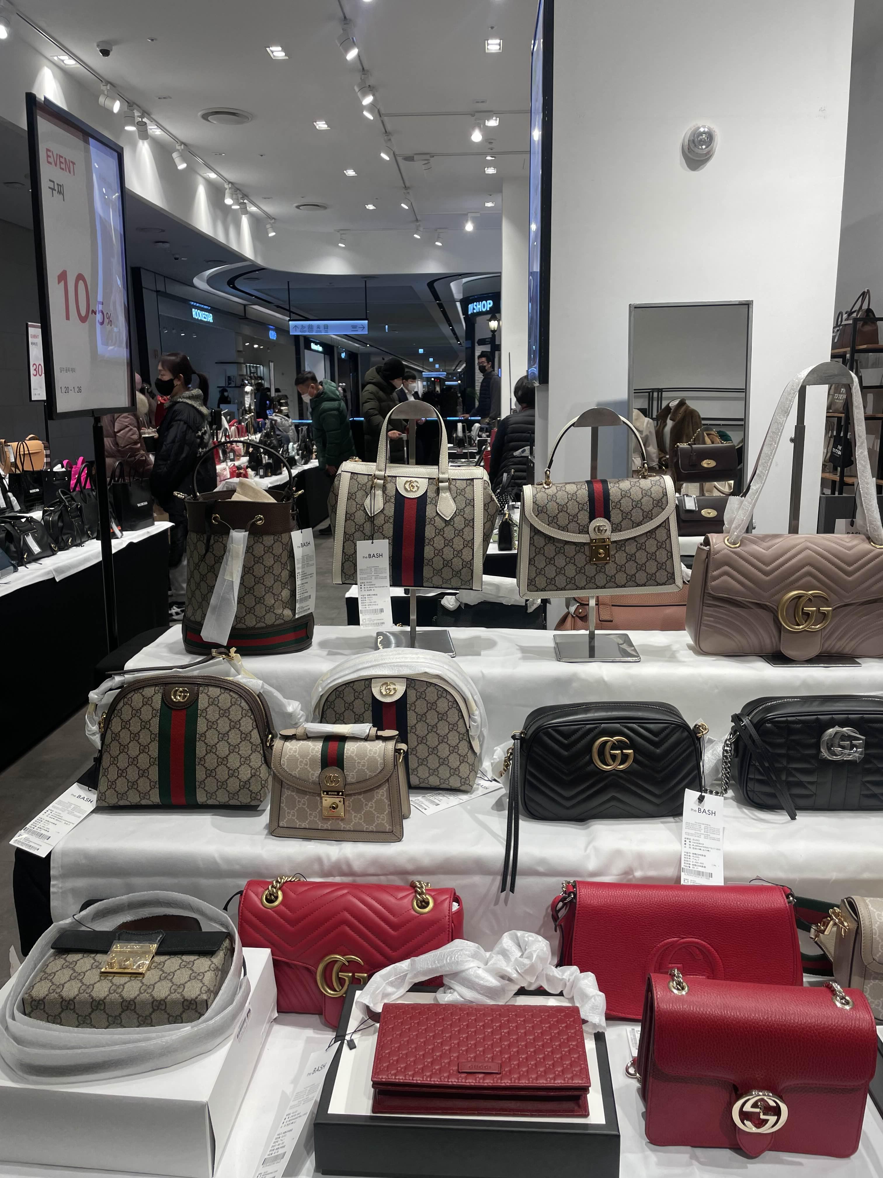 슥봐도 휘뚜루 마뚜루 매고 다니기에 좋아보이는 가방들이 제법 많았다. 할인 중인 제품들이지만 종류도 많았고 디자인도 괜찮았음. 구찌같은 경우에는 할인율이 5~10% 이었는데 100만원대부터 200,300만원대까지 가격대가 다양했다.