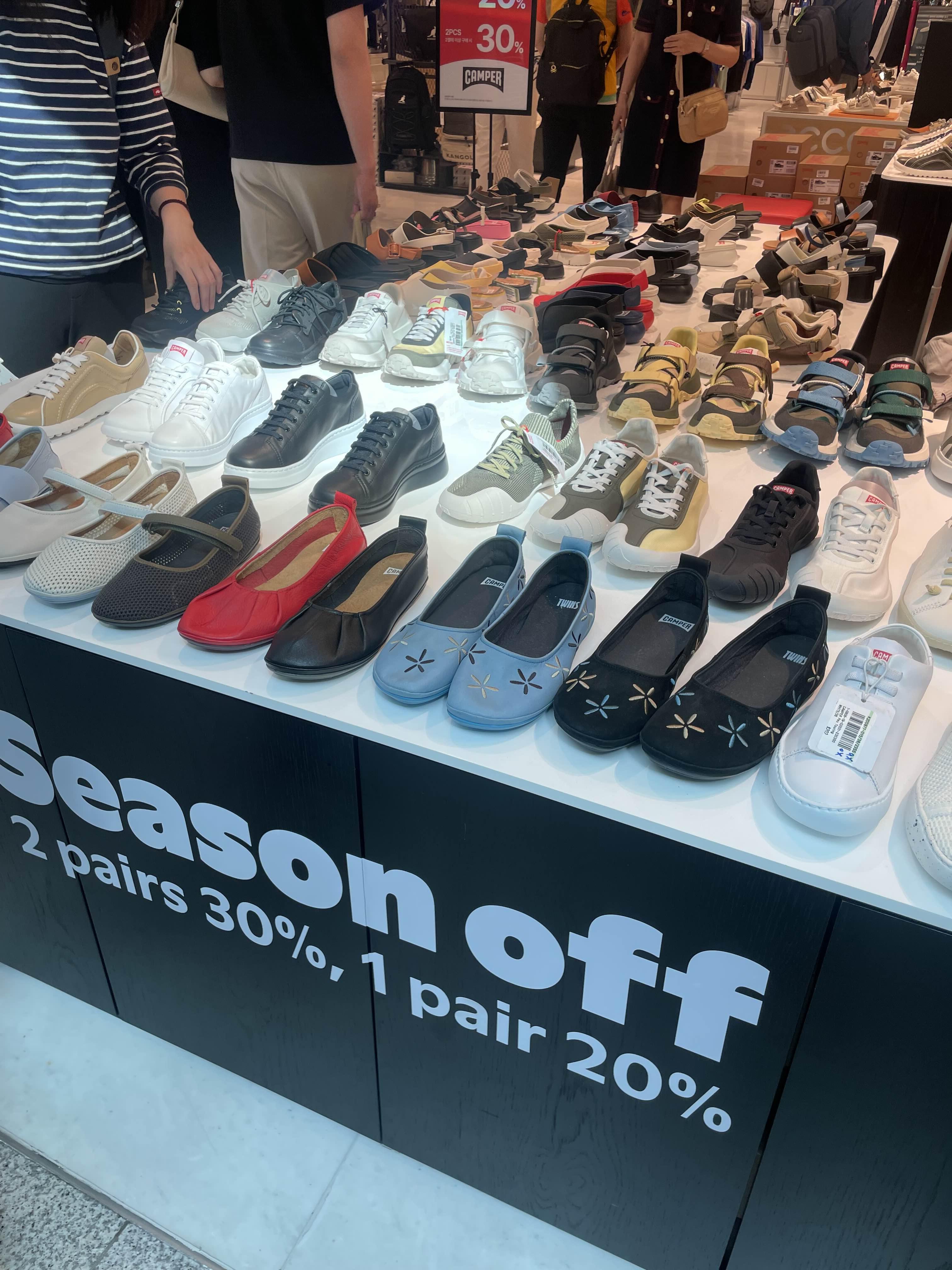 캠퍼 브랜드는 제가 잘 모르는데 사람들이 바글바글 거려서 구경해봤어요. 한켤레 20프로 두켤레 30프로 할인이 들어가고 있습니다 할인기간은 7월 6일까지에요