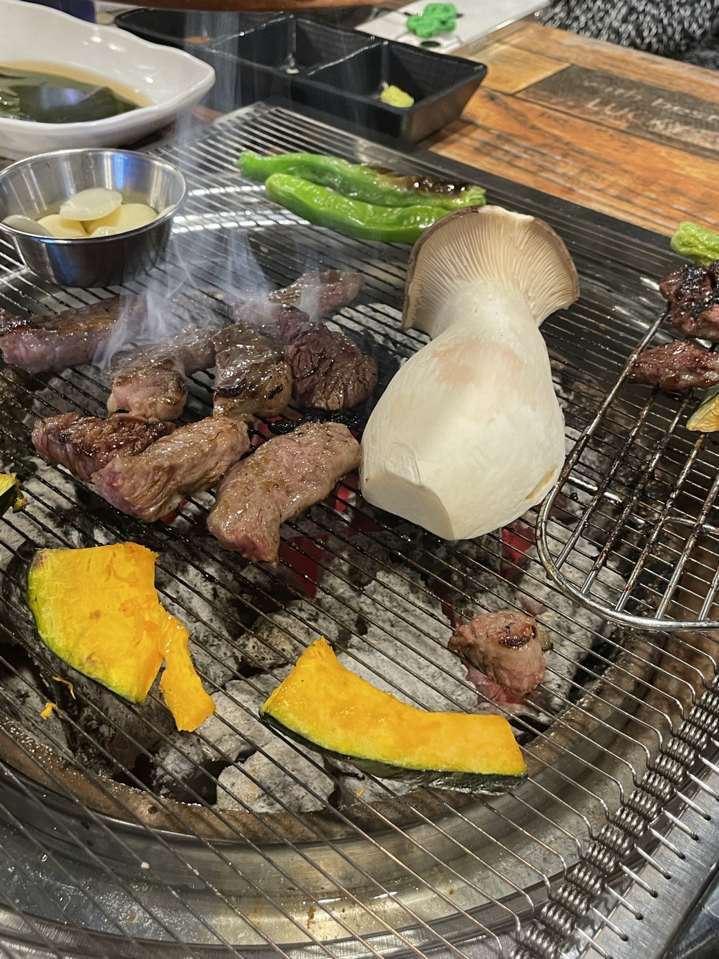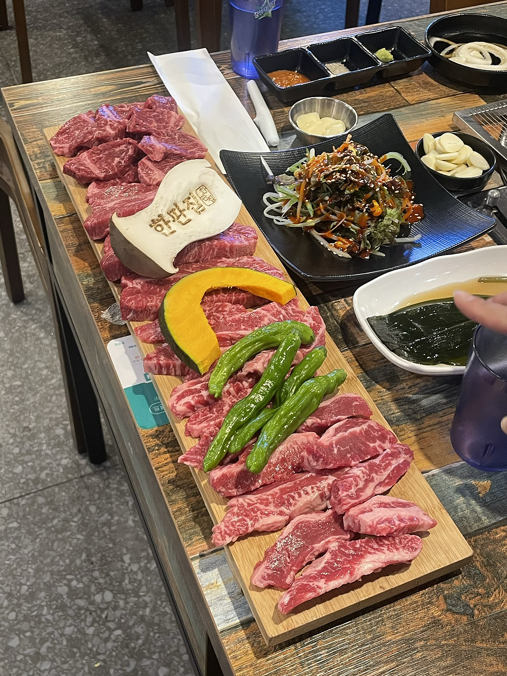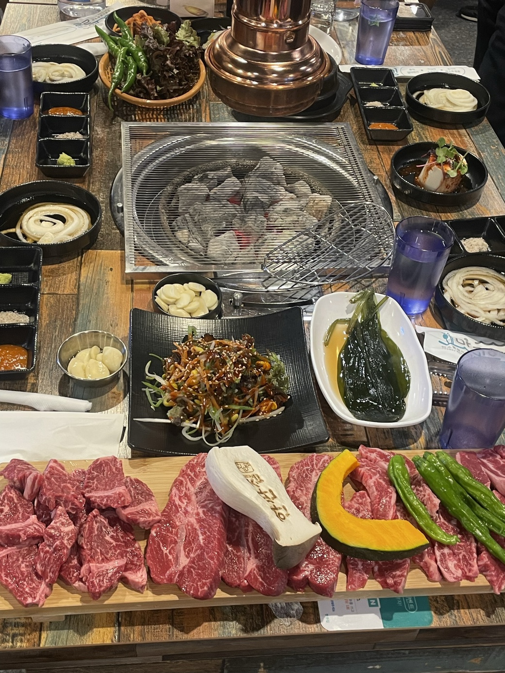 기본찬은 종류가 실속있게 많았고, 모듬은 소생갈비살, 생부채살, 생토시살, 버섯, 호박, 고추로 구성되어 있습니다