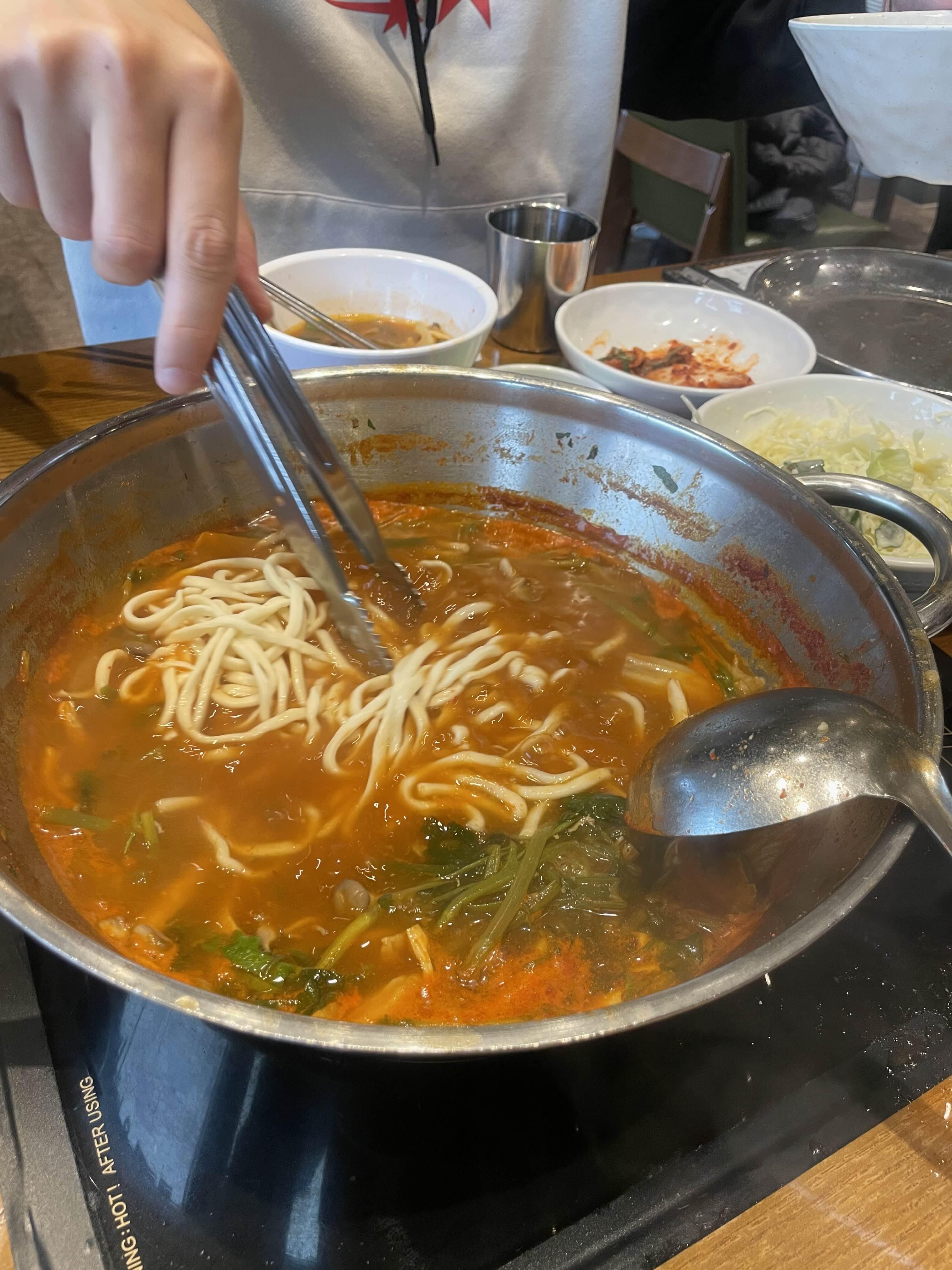 칼칼한 국물에 칼국수 사리 넣어줬어요. 칼국수 면발이 쫄깃하고 국물이랑 잘 어울려요
